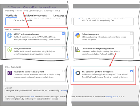 The new installation experience has separate workloads based on what type of work you intend to do. For this lab, select the ASP.NET and web development workload as well as the .NET Core cross-platform development workload.