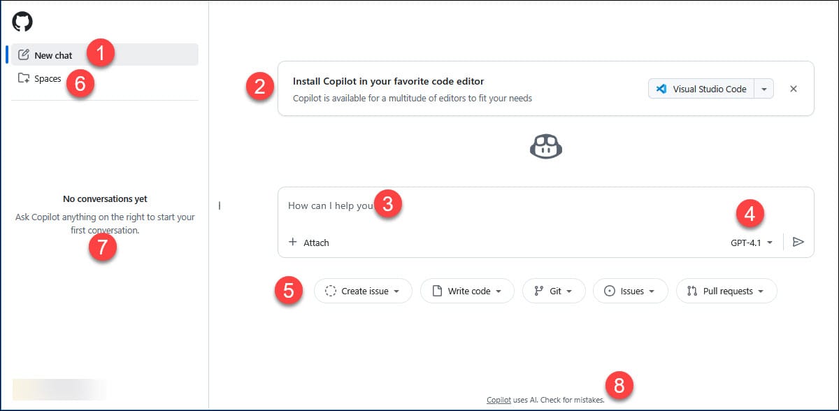 [5] As of October 2025, you'll find five pill buttons that each have additional options when you click the dropdown. These are conversation starters that help you start a conversation with GitHub Copilot to accomplish github.com related tasks.